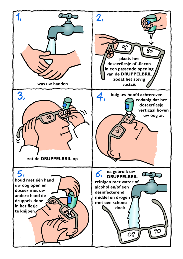 LET OP: De bril is niet geschikt voor flesjes (Minims) met lange pipet. Door de lange hals kan de pipet in contact komen met uw oog. Ook is de bril niet geschikt voor ooggels.